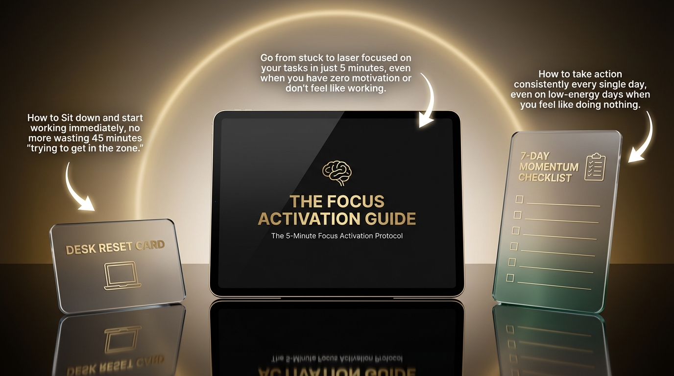 The complete system built around The Laser-Focus Activation Protocol - a neuroplasticity-based method backed by research from Stanford, MIT, and peer-reviewed journals that makes starting automatic in just 5 minutes, even when you have zero motivation.