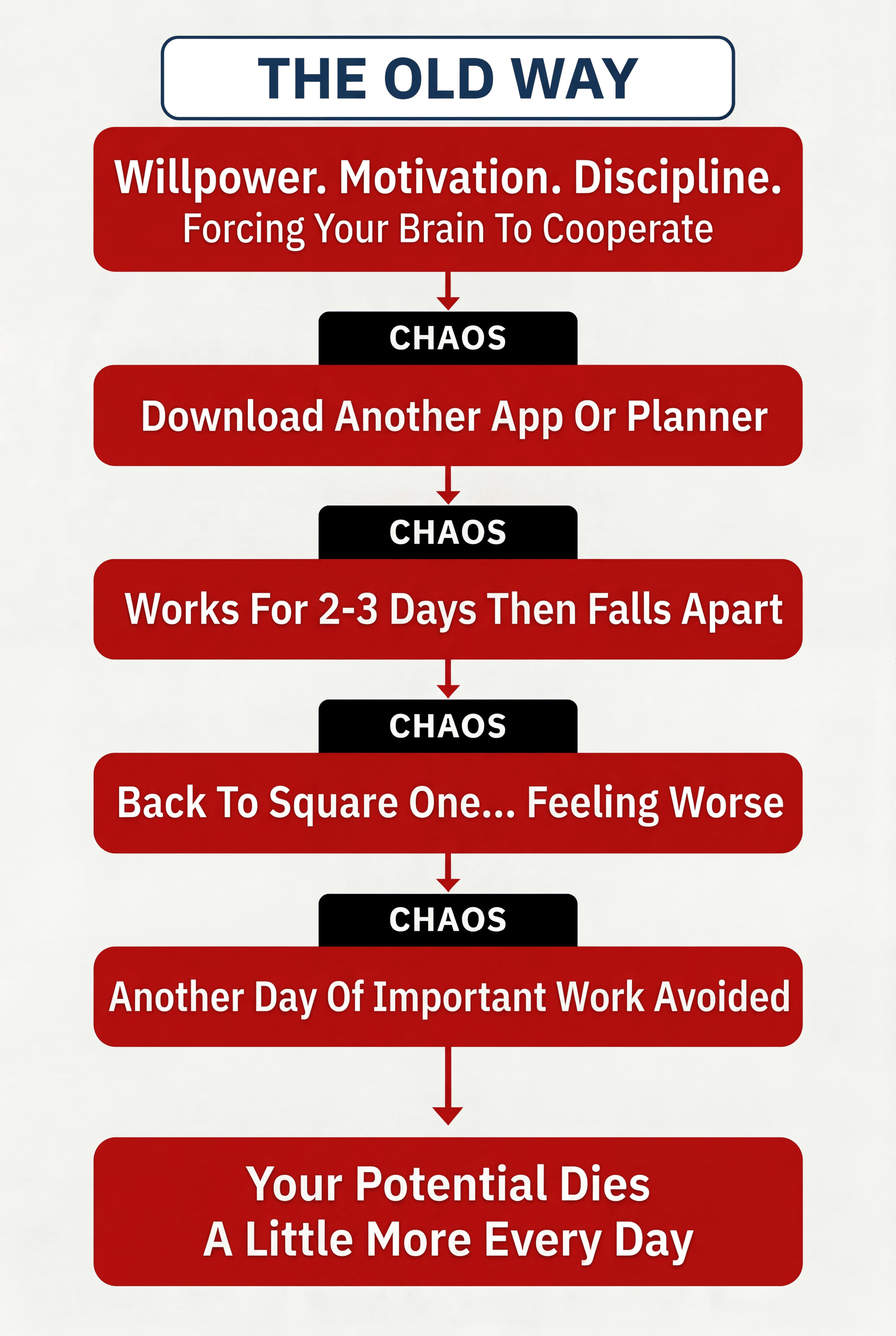 This is the old way: forcing yourself with willpower, waiting for motivation to strike, holding out for the "perfect moment" that never comes.