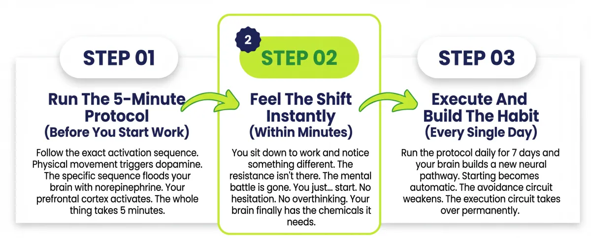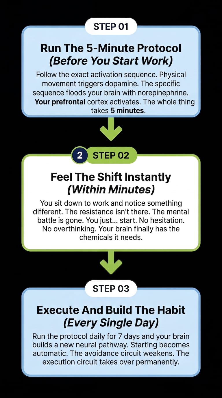 Day 1: You run the 5-minute protocol. Your brain releases the exact chemicals needed for focus. You sit down and... you're actually excited to start. No mental battle. No hesitation. It feels strange because it's so easy.